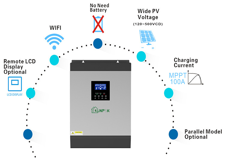 Sunpok 5Kw เฟสเดียวอินเวอร์เตอร์ออฟกริดความถี่สูงเหมาะสำหรับพื้นที่ที่ไม่มีไฟฟ้า พื้นที่พเนจร สถานีฐานการสื่อสาร พื้นที่ที่มีไฟฟ้าไม่เสถียร เกาะ เสาชายแดน สำนักงานจัดการทิวทัศน์ แผงขายหนังสือพิมพ์ ชุดแบตเตอรี่สำหรับผู้ผลิตแบตเตอรี่ ฯลฯ มาพร้อมกับจอแสดงผล LED รองรับ USB/RS232/RS485/Bluetooth/Dry-contact การออกแบบที่กะทัดรัด และประสิทธิภาพที่คุ้มค่า