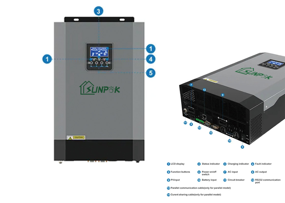 Sunpok 5Kw เฟสเดียวอินเวอร์เตอร์ออฟกริดความถี่สูงเหมาะสำหรับพื้นที่ที่ไม่มีไฟฟ้า พื้นที่พเนจร สถานีฐานการสื่อสาร พื้นที่ที่มีไฟฟ้าไม่เสถียร เกาะ เสาชายแดน สำนักงานจัดการทิวทัศน์ แผงขายหนังสือพิมพ์ ชุดแบตเตอรี่สำหรับผู้ผลิตแบตเตอรี่ ฯลฯ มาพร้อมกับจอแสดงผล LED รองรับ USB/RS232/RS485/Bluetooth/Dry-contact การออกแบบที่กะทัดรัด และประสิทธิภาพที่คุ้มค่า